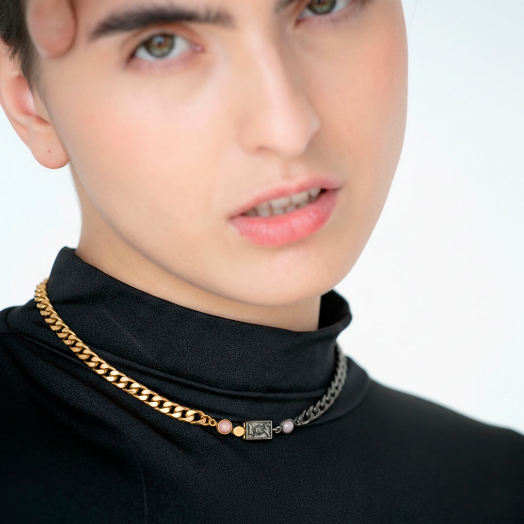 is a talisman necklace that represents the sacred moment when the sun is born: when night still lingers and light begins to take shape. It is the union of two opposing forces that do not clash, but rather support each other.