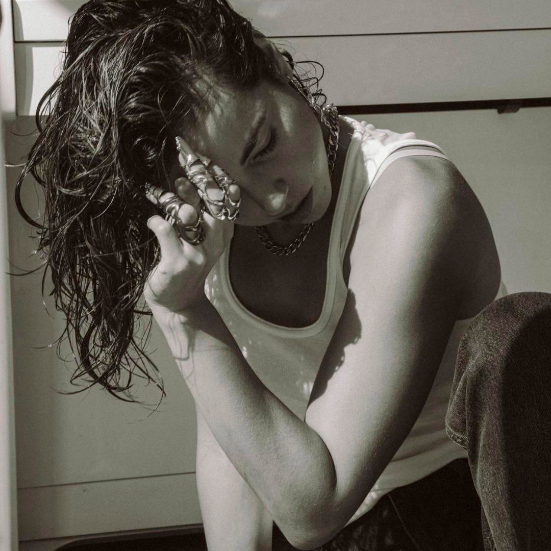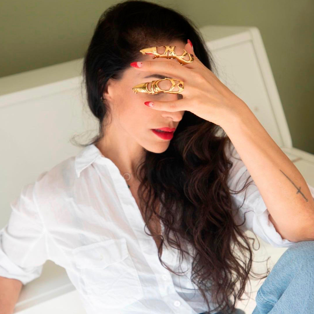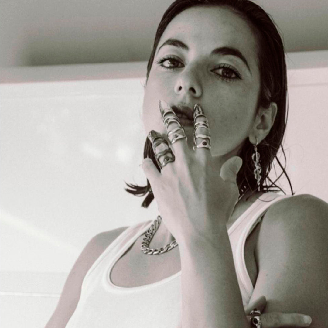 The GALATEA RING represents a powerful, independent woman with a strong personality. It is imbued with magical qualities, evoking a sense of enchantment. The inclusion of a garnet stone signifies love, passion, protection, and strength.